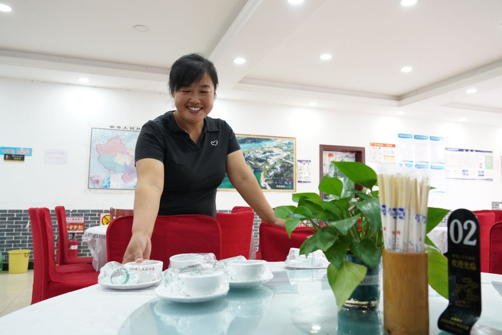 石家莊平山縣西柏坡鎮西柏坡村村民齊紅寶在經營的酒店里擺放餐具(2023年10月18日)。新華社記者 朱旭東 攝