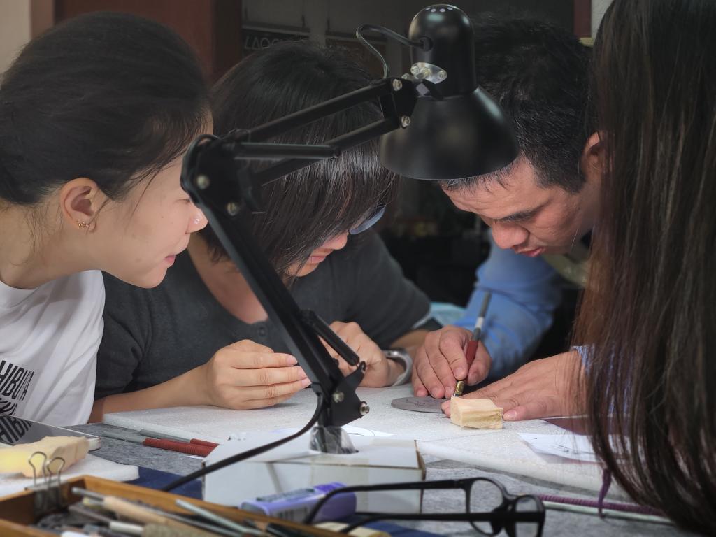 上海市民藝術夜校篆刻陶刻課堂上吳寶平(左三)正在指導雕刻手法。新華社記者 王默玲 攝