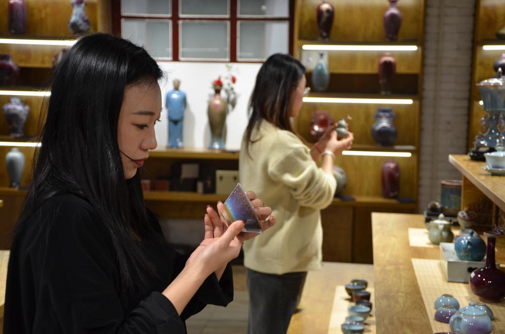 游客來到鈞瓷工業文化園,可以在鈞瓷技藝傳習館體驗鈞瓷制作過程,在神垕老食堂品嘗當地特色美食,還可以到文創商店挑選一件喜歡的鈞瓷小器帶回家?!拔覀兿M慰驮诖烁惺茆x瓷工藝的歷史傳承,沉浸式體驗鈞瓷文化?!眻@區相關負責人介紹。