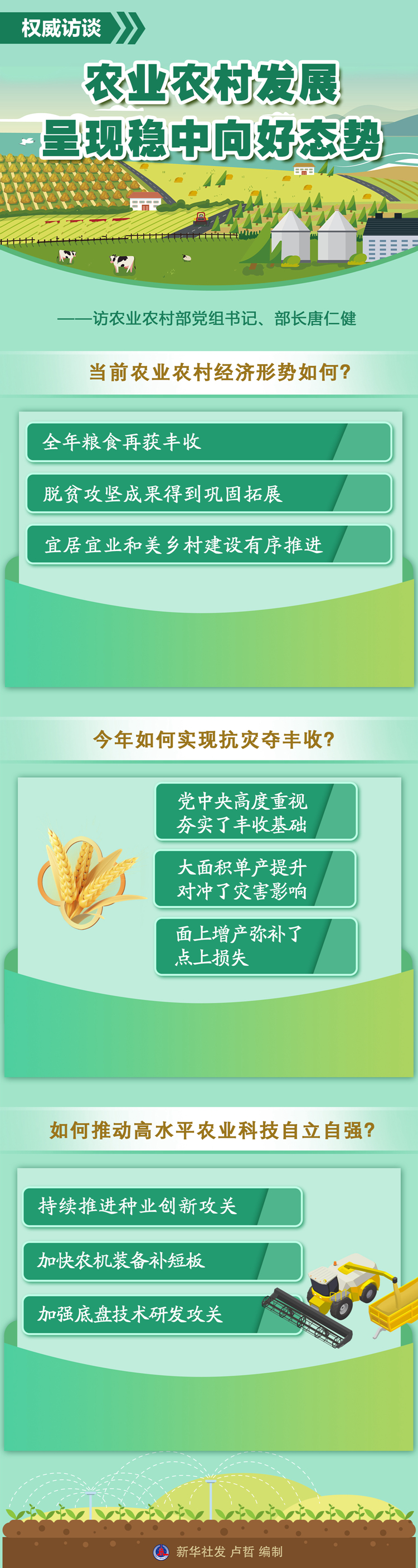 新華社北京11月8日電 題:農業農村發展呈現穩中向好態勢——訪農業農村部黨組書記、部長唐仁健