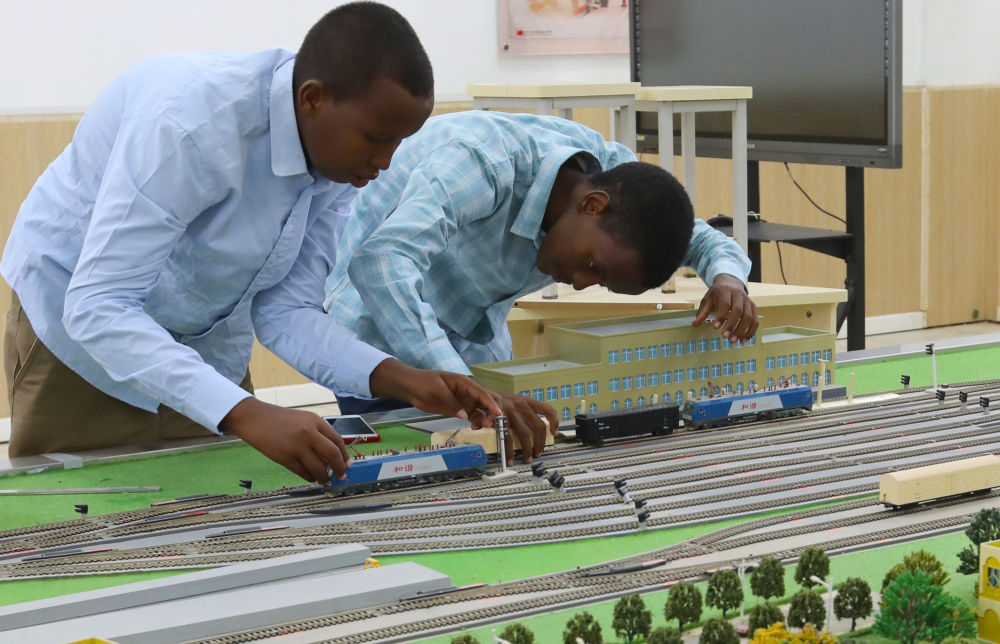 在位于吉布提首都吉布提市的吉布提工商學校,學生在魯班工坊鐵道運營沙盤教學區學習(2022年9月19日攝)。新華社記者 董江輝 攝