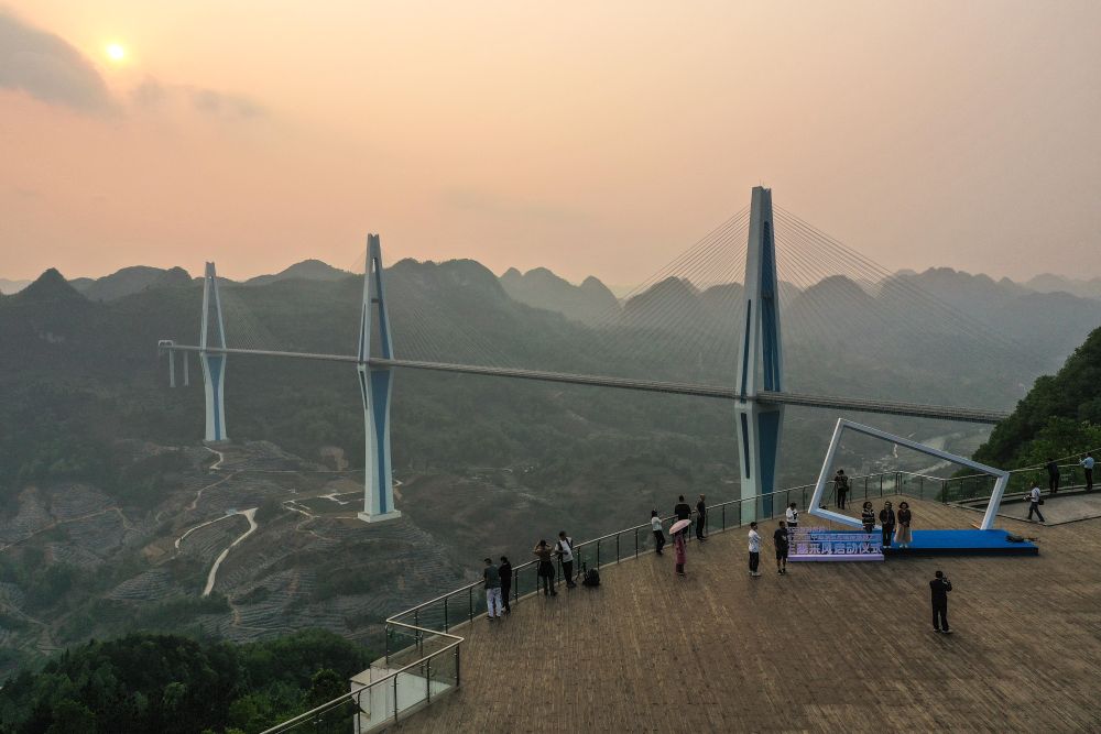 游客在貴州平羅高速公路“天空之橋”觀光服務區觀景臺觀賞平塘特大橋(2023年4月13日攝,無人機照片)。新華社記者 楊文斌 攝