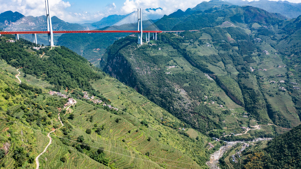 貴州、云南交界處的杭瑞高速北盤江大橋(2023年8月16日攝,無人機照片)。新華社記者 陶亮 攝