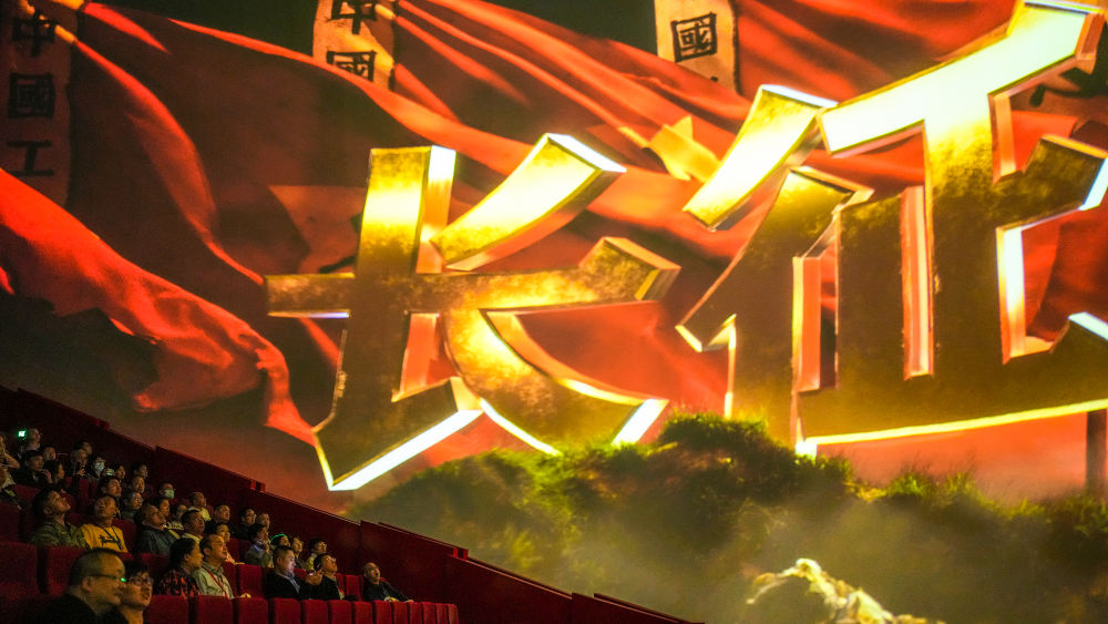 觀眾在位于貴陽市的“紅飄帶”數字體驗館內觀看體驗長征故事(2023年10月22日攝)。新華社記者 陶亮 攝
