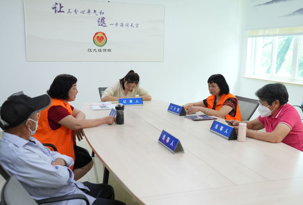 在浙江省諸暨市暨陽街道江新社區“江大姐”調解室,兩名調解員在為群眾進行調解(2023年5月26日攝)?!敖蠼恪闭{解室主要由女性組成,針對社區特點,為周邊居民調解鄰里、家庭矛盾。新華社記者 翁忻旸 攝