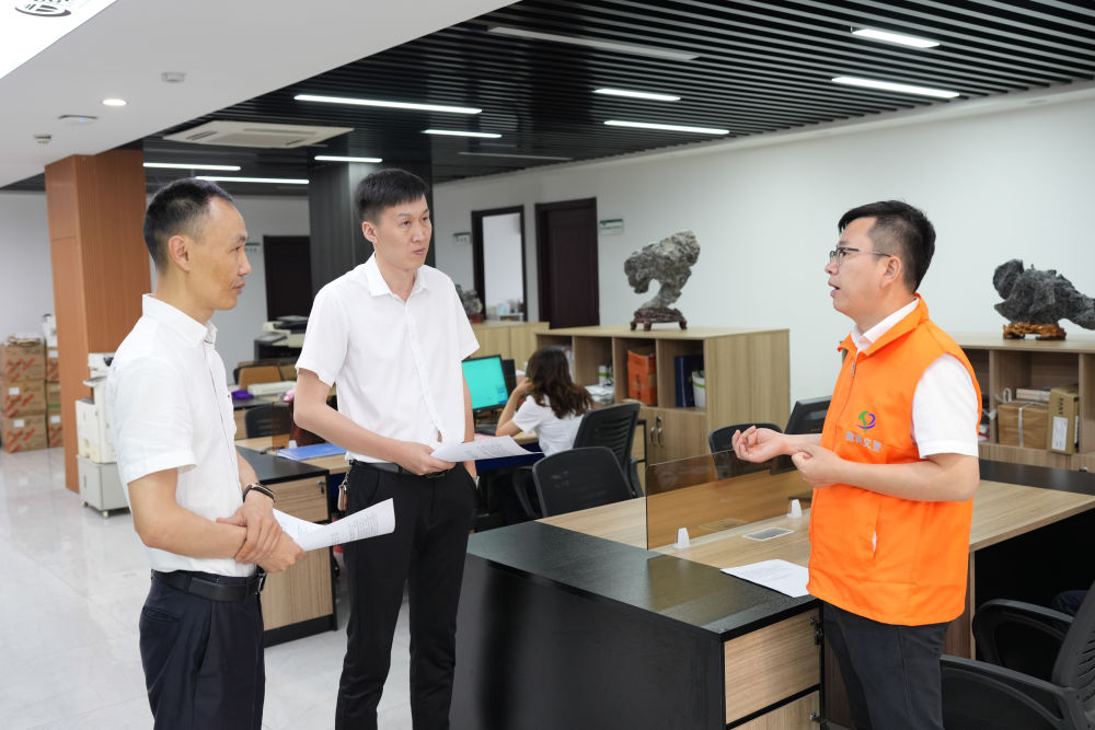 “徽商義警”張勤波(右)在一家徽商企業走訪,了解其在運營中遇到的問題(2023年5月26日攝)。浙江省諸暨市公安局徽商警企聯絡室成立于2020年,由徽商代表組成,目前共有210名“徽商義警”,為在諸暨經商務工的7.5萬名同鄉提供經濟、治安類調解服務。新華社記者 翁忻旸 攝
