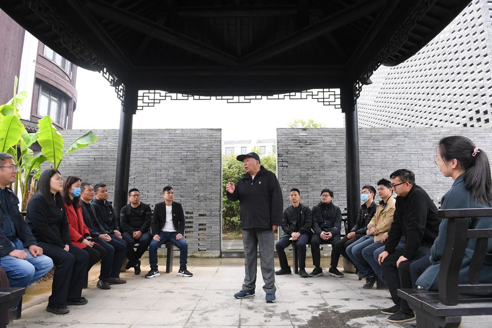 浙江省諸暨市楓橋鎮魏廉村老黨員魏杏根(中)在楓橋經驗陳列館的亭子內和年輕黨員分享當年運用“楓橋經驗”化解基層矛盾的故事(2021年4月11日攝)。新華社記者 翁忻旸 攝