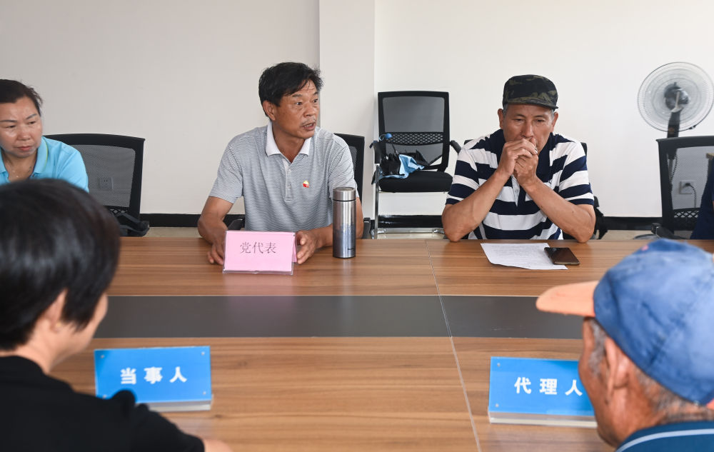 在浙江省諸暨市東白湖鎮婁東村新時代文明實踐站,網格長召集村里矛盾雙方當事人以及黨員代表、鄉賢代表、人大代表等進行宅基地指標糾紛的現場調解(2023年7月26日攝)。新華社記者 徐昱 攝