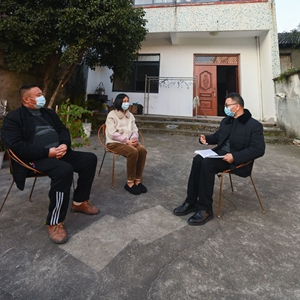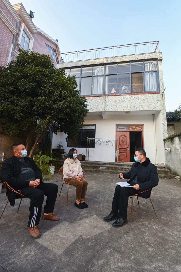 浙江省湖州市吳興區道場鄉老潘調解工作室的調解員潘水方(右)在錢山下村村民家中進行回訪(2023年1月12日攝)。新華社記者 徐昱 攝
