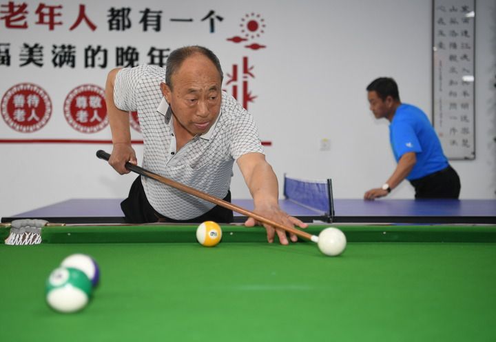 老年人在雄安新區容西第一養老驛站打臺球(2023年4月10日攝)。新華社記者 朱旭東 攝