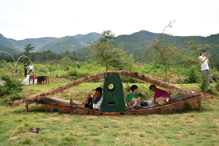 “大元社”后的草坪上有一個用竹條、樹枝搭建的“毛毛蟲的巢穴”,它的創意設計源于——12歲女孩茜茜的“夢”。