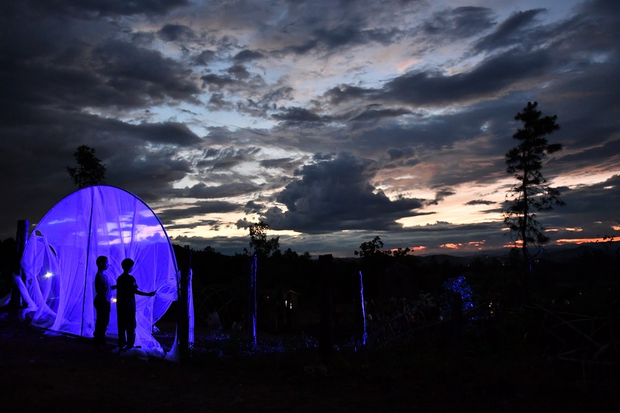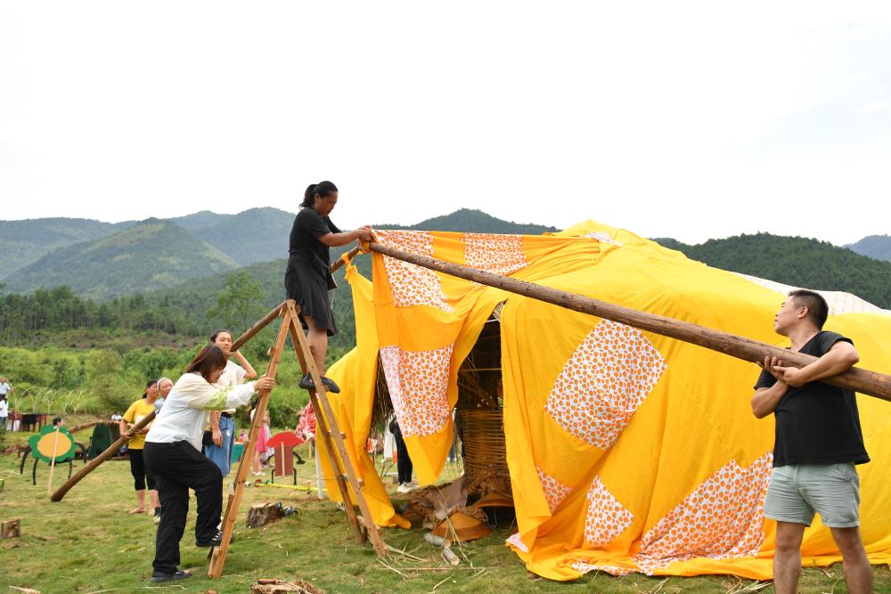 8月20日,周燕(左上)和志愿者、村民們一起搭建裝置藝術作品“蘑菇屋”。新華社記者 陳振海 攝