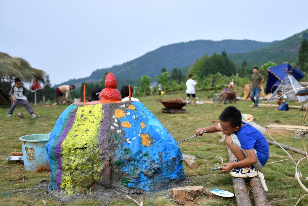 8月19日,小朋友在大元社草坪劇場的陶土裝置上繪畫。新華社記者 陳振海 攝