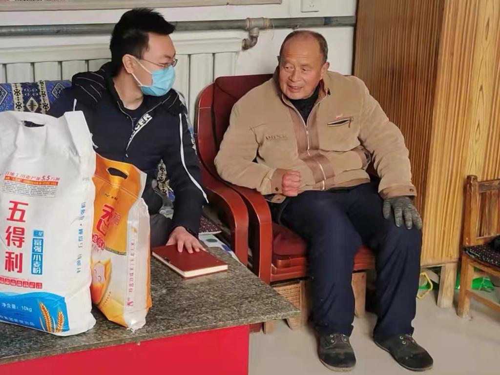 馮維?。ㄗ笠唬┰诖汗澢跋θ霊糇咴L新河縣尋寨鎮尋寨村的建檔立卡戶。(于勝斌 攝)