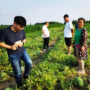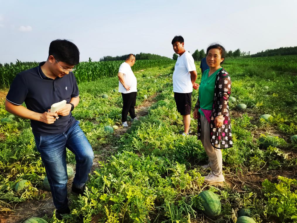 在新河縣尋寨鎮,杜一方(左一)在采訪瓜農。(邱英亮 攝)