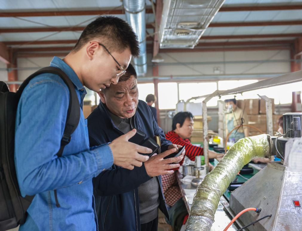 蘇凱洋(左一)在新河縣一家眼鏡盒企業采訪產業發展情況。(李世強 攝)
