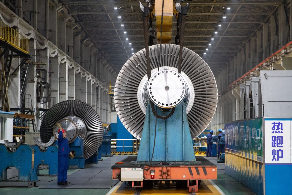 2023年4月28日,工作人員在哈電集團哈爾濱汽輪機廠有限責任公司車間內工作。新華社記者 張濤 攝