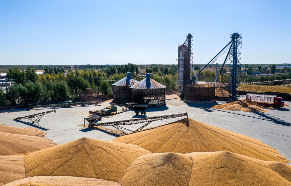 2023年10月15日,在內蒙古通遼市科爾沁左翼中旗一家收糧站,收儲的玉米堆被風干晾曬(無人機照片)。新華社記者 連振 攝