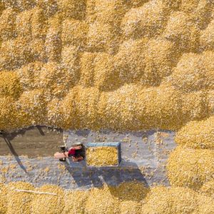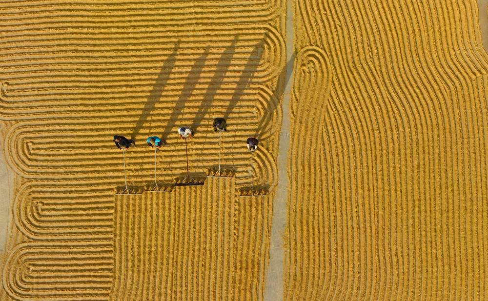2023年10月12日,在遼寧省燈塔市禾谷茂源水稻種植專業合作社,農民在晾曬收獲的水稻(無人機照片)。新華社記者 楊青 攝
