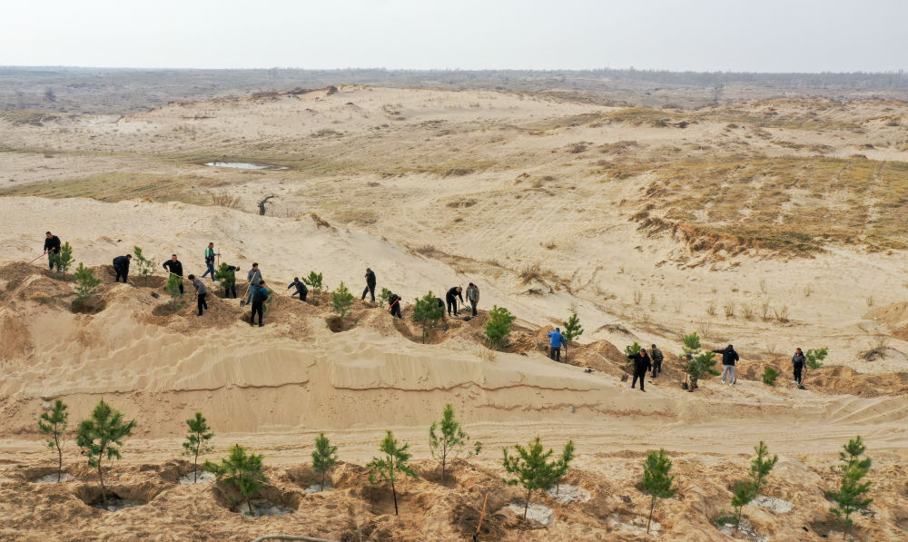 2023年4月15日,在內蒙古通遼市科爾沁左翼后旗,治沙工人在科爾沁沙地植樹造林(無人機照片)。新華社記者 連振 攝