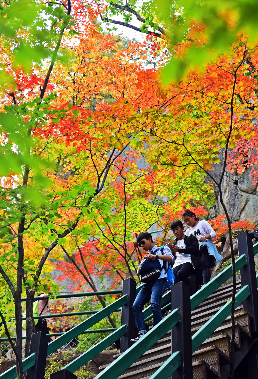 游客在遼寧省桓仁縣楓林谷森林公園游玩(2016年10月3日攝)。新華社記者 楊青 攝