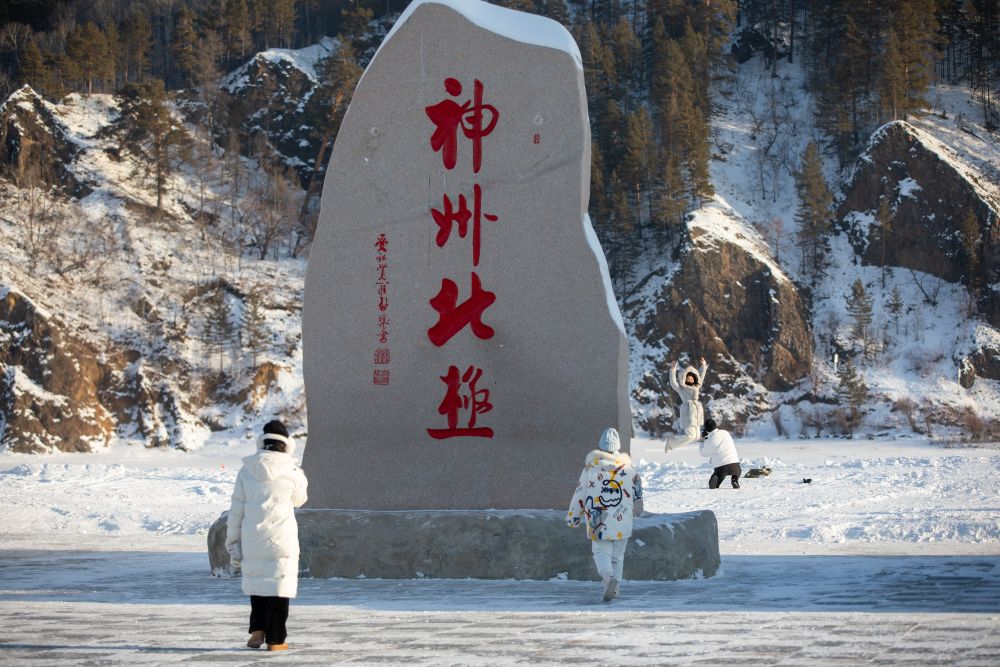 2023年1月10日,在黑龍江省漠河市北極村神州北極廣場,游客在拍照留念。新華社記者 張濤 攝