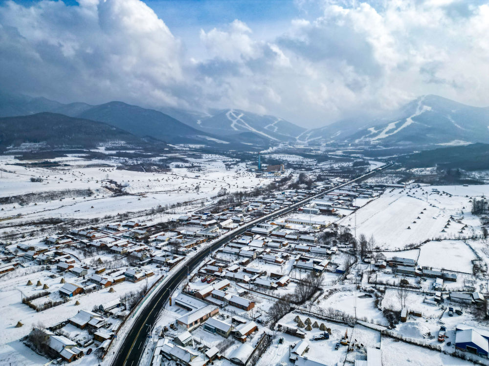 這是2023年1月19日拍攝的吉林北大湖滑雪場附近的北大湖鎮南溝村(無人機照片)。新華社記者 顏麟蘊 攝