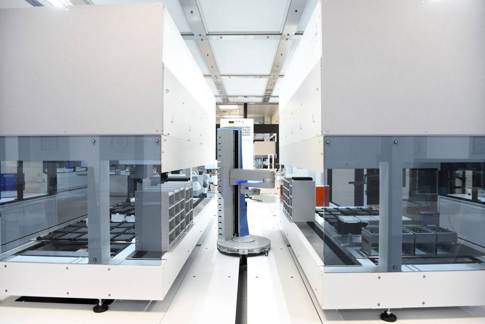 在一個個透明的功能島里,機械臂正熟練地把多個生物試劑和樣品準確地放進微孔板,自動化小車在各個功能島之間來往運送實驗用品,一個智能化的“生命鑄造工廠”井然有序地運轉。