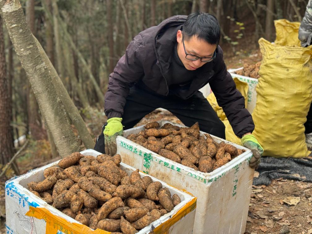 工作人員正在搬運一箱新鮮天麻。新華社記者趙佳樂 攝