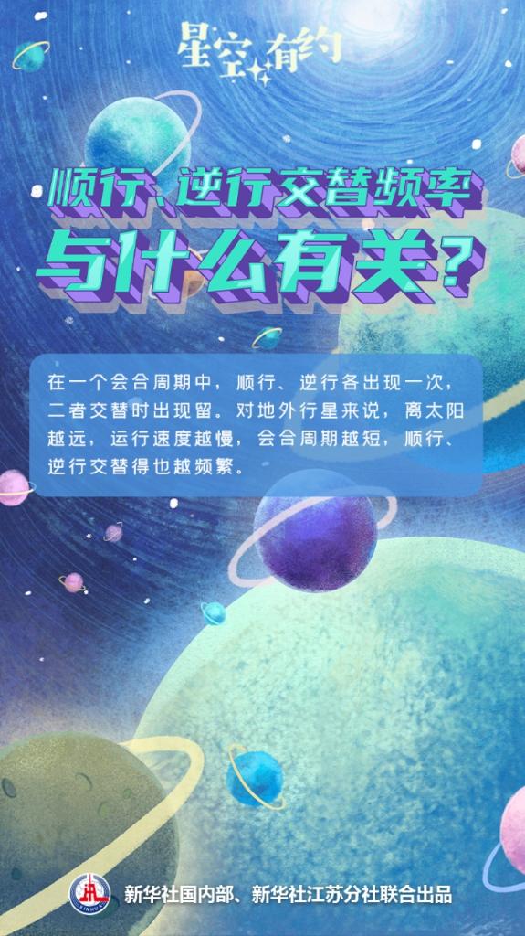 行星順行、逆行的發生頻率,取決于它們和地球的會合周期?!巴ㄋ椎刂v,地球和地外行星都在圍繞太陽‘跑圈’。地球比地外行星多‘跑’一圈,再次‘追上’地外行星的時間就是會合周期?!堋迷铰男行?,地球越容易‘追’上,會合周期越短?!蓖蹩瞥f。