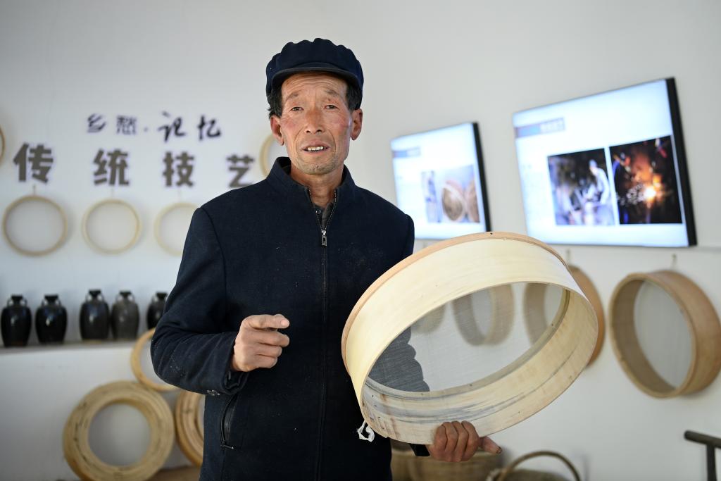 11月30日,在甘肅省環縣耿塬畔村莊子峁村民小組,村民楊滿銀展示自己制作的籮篩。新華社記者 范培珅 攝