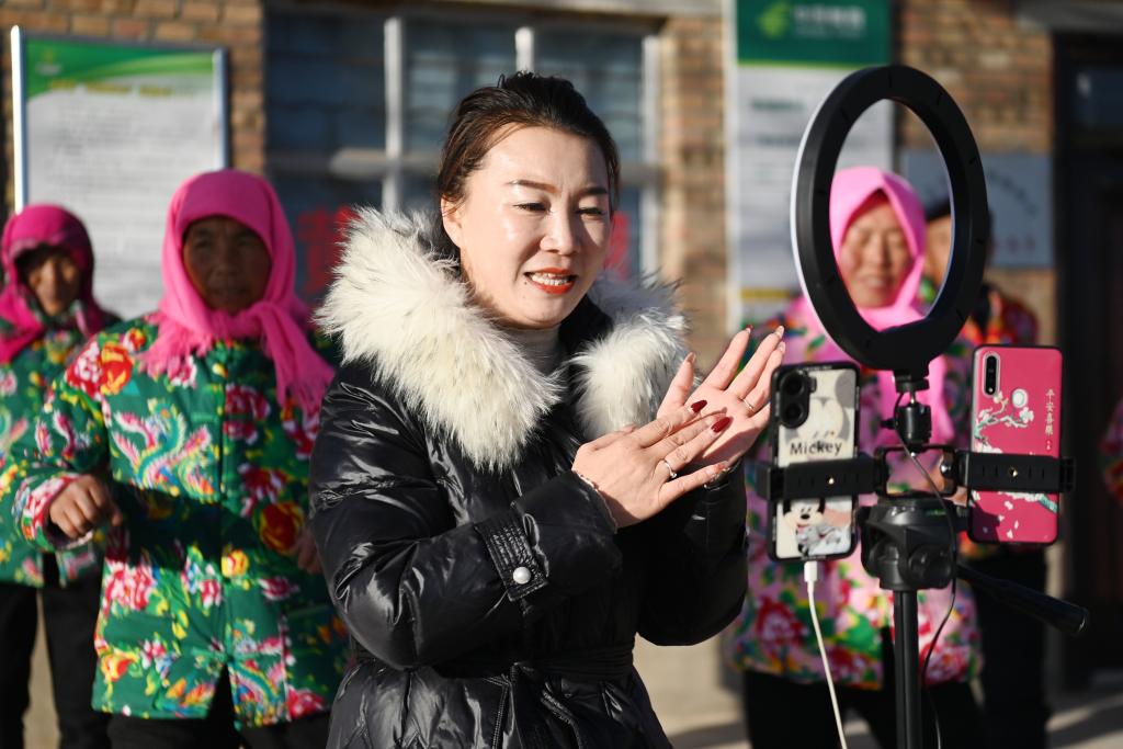 11月30日,在甘肅省環縣耿塬畔村莊子峁村民小組,楊清艷和幾位村民正在直播。新華社記者 范培珅 攝