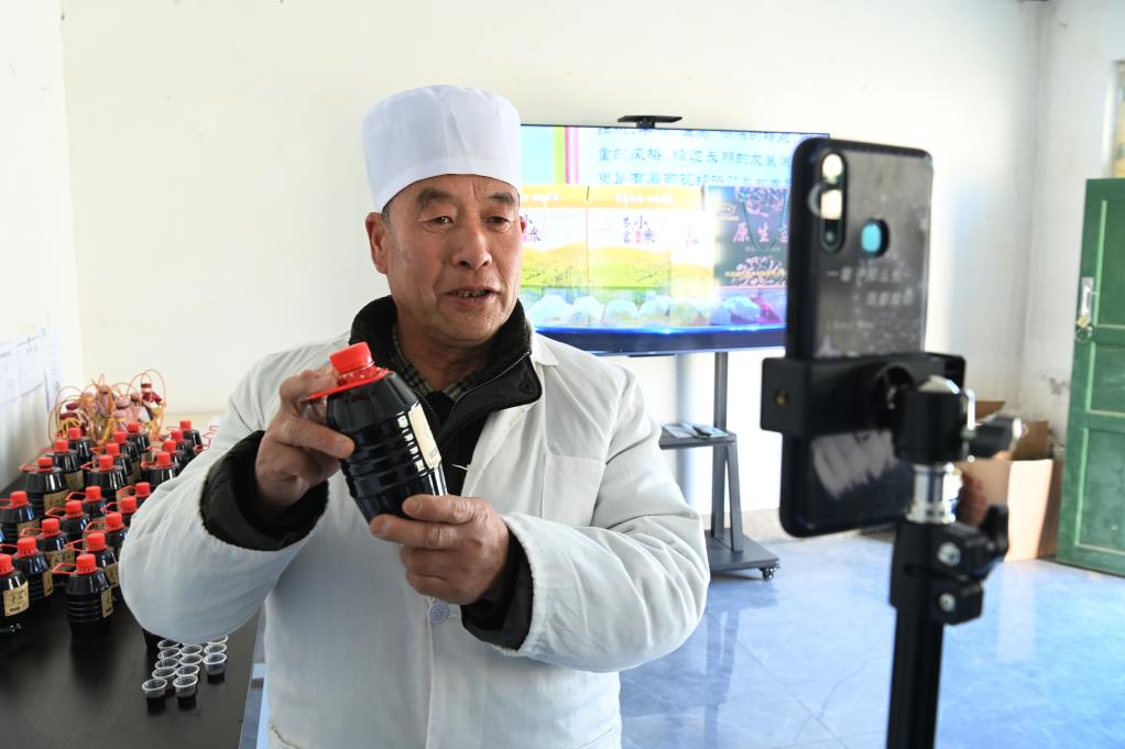 11月30日,在甘肅省環縣耿塬畔村莊子峁村民小組,村民王克弟通過直播銷售自家釀制的醋。新華社記者 范培珅 攝
