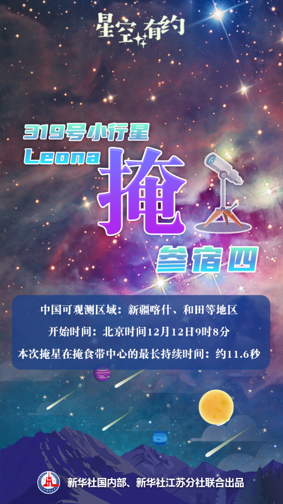 新華社南京12月10日電(記者邱冰清、秦華江)中國科學院紫金山天文臺科普主管王科超介紹,北京時間12月12日,319號小行星Leona將掩恒星參宿四。最早能看到本次掩星過程的是中國新疆喀什、和田等地區,開始時間是當日9時8分。本次掩星在掩食帶中心的最長持續時間約為11.6秒。