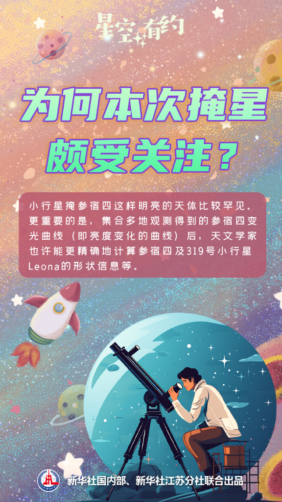 太陽系的行星、小行星等在移動時,時常會掩住遠處的恒星。不過,小行星掩參宿四這樣明亮的天體比較罕見?!皯{肉眼看到參宿四明顯變暗或‘消失’,將會是一次難得的體驗?!蓖蹩瞥榻B說,此次掩星不僅有觀賞性,還具有科學價值。集合多地觀測得到的參宿四變光曲線(即亮度變化的曲線)后,天文學家也許能更精確地計算參宿四及319號小行星Leona的形狀信息等。