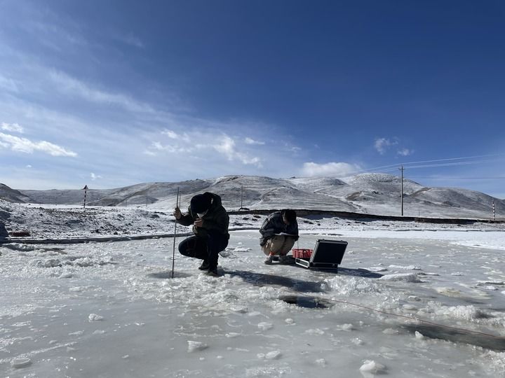 2023年1月3日,青海省水文水資源測報中心工作人員在青海省玉樹藏族自治州隆寶河進行破冰測流。(受訪單位供圖)