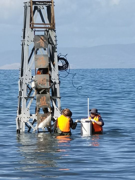 2023年9月6日,青海省水文水資源測報中心工作人員對設立在青海湖上的自記水位計進行數據下載和設備運行維護工作。(受訪單位供圖)