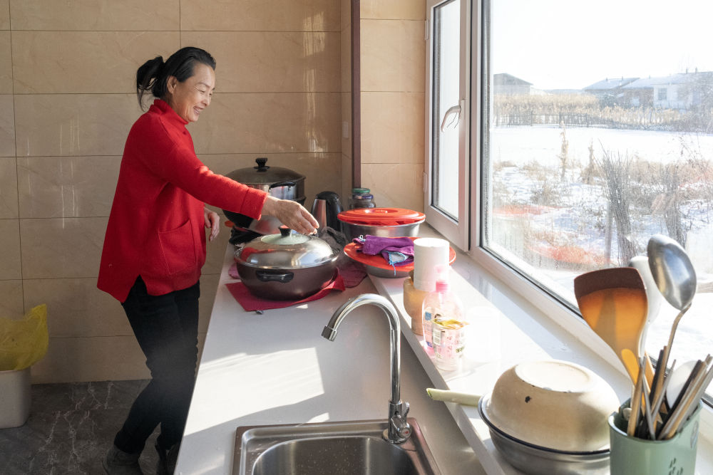 2023年12月12日,在黑龍江省尚志市老街基鄉基豐村,村民宋曉菊在新建成的房屋里做家務。新華社記者 謝劍飛 攝