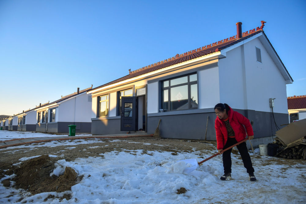2023年12月7日,吉林省舒蘭市開原鎮新開村村民徐中仁在新房門前清理積雪。新華社記者 許暢 攝
