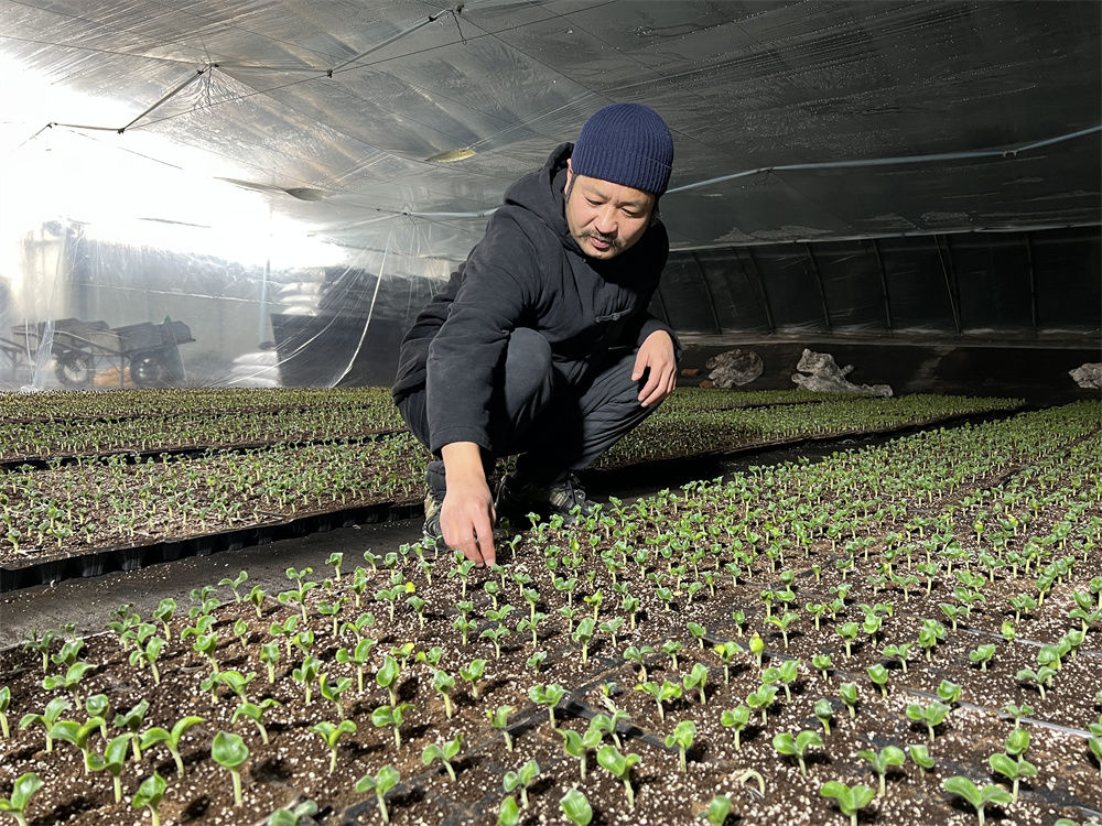 2023年12月15日,天津市靜海區臺頭鎮義和村種植大戶郝建在照料西瓜秧苗。新華社記者 白佳麗 攝