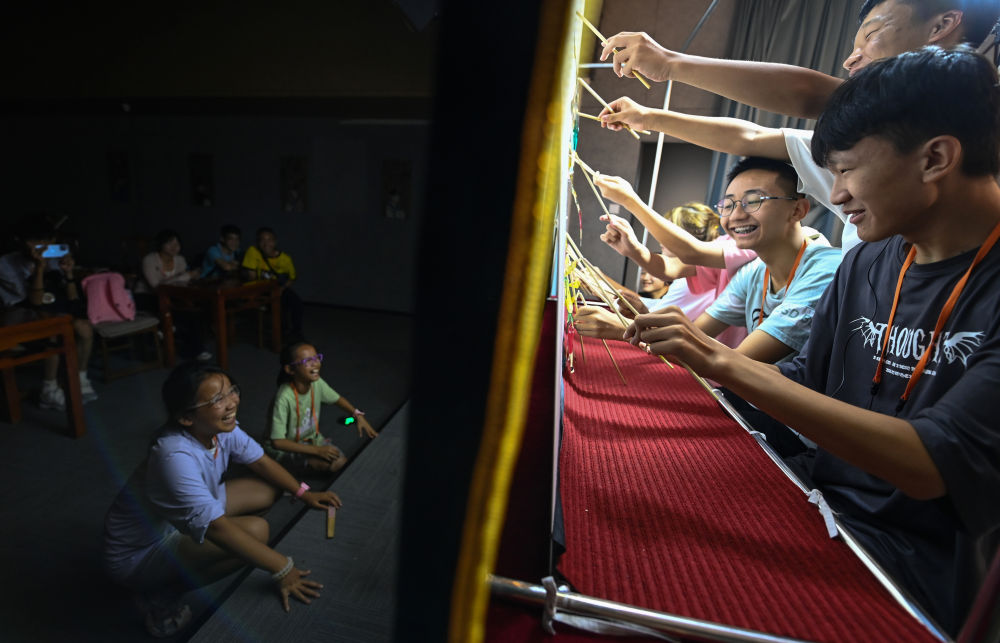 2023年8月8日,進行暑期研學的學生在位于陜西省西安市的中國秦腔藝術博物館體驗皮影戲演出。新華社記者 鄒競一 攝