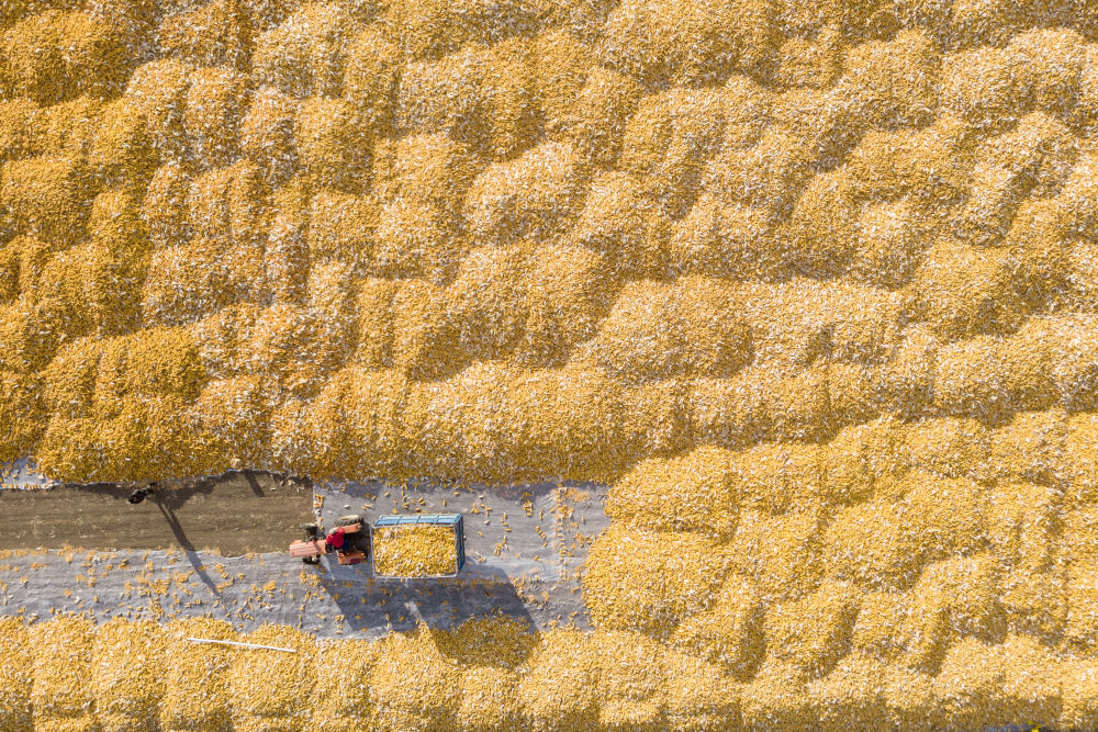 2023年10月19日,在黑龍江省肇東市五里明鎮東升村,農民把收獲的玉米運到當地農業合作社指定的地點進行晾曬(無人機照片)。新華社記者 謝劍飛 攝