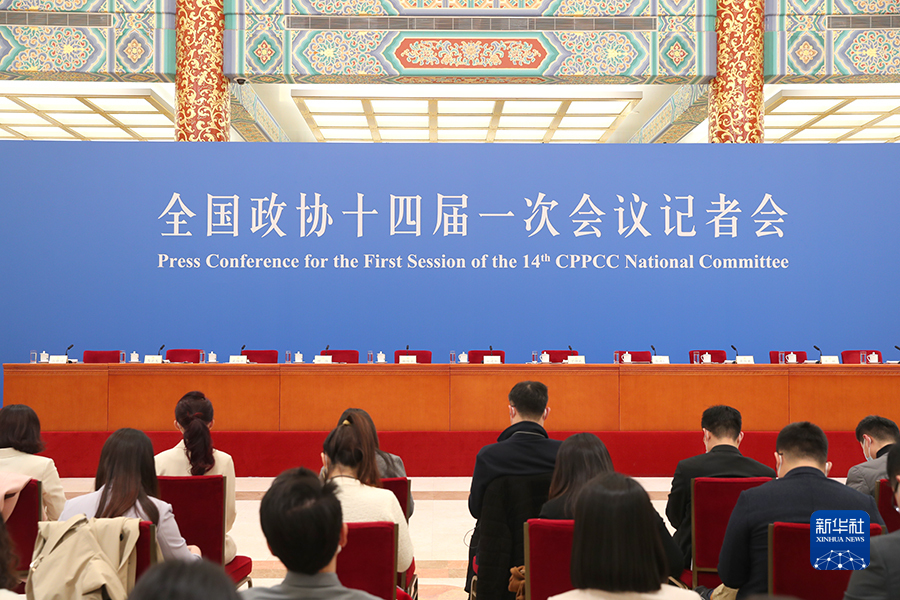 3月5日下午3時,全國政協十四屆一次會議在人民大會堂三樓金色大廳舉行民主黨派中央和全國工商聯領導人記者會,請各民主黨派中央主席和全國工商聯主席出席并回答記者提問。圖為記者會現場。新華網記者 焦鵬 攝