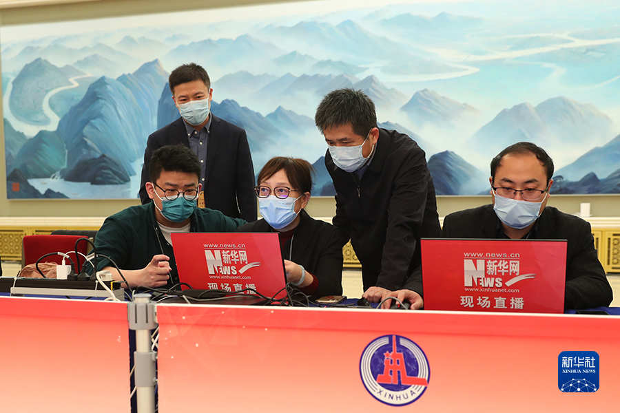 3月5日下午3時,全國政協十四屆一次會議在人民大會堂三樓金色大廳舉行民主黨派中央和全國工商聯領導人記者會,請各民主黨派中央主席和全國工商聯主席出席并回答記者提問。圖為現場直播團隊正在進行直播。新華網記者 焦鵬 攝