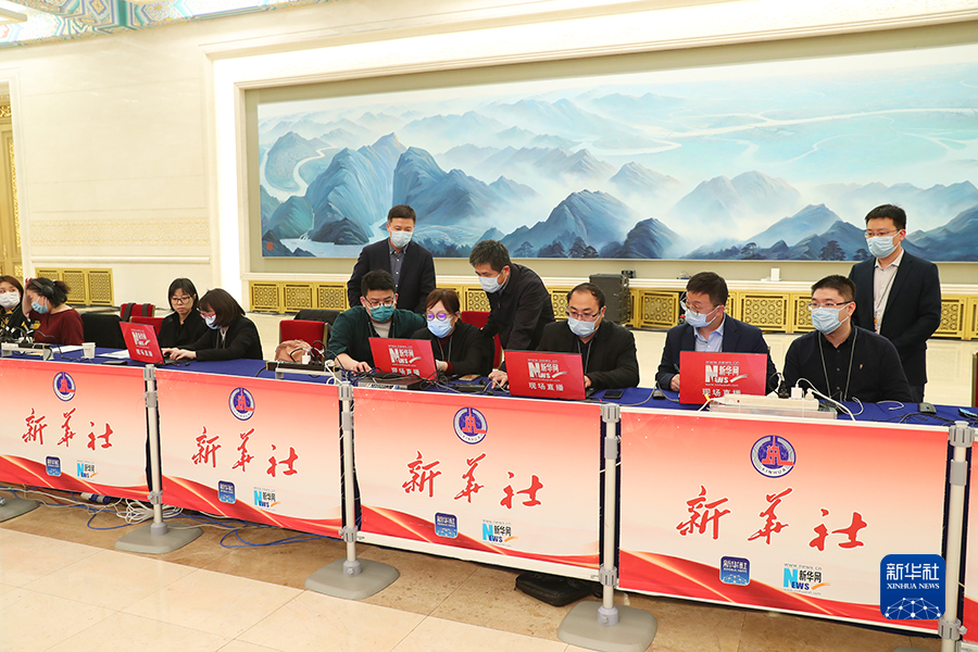 3月5日下午3時,全國政協十四屆一次會議在人民大會堂三樓金色大廳舉行民主黨派中央和全國工商聯領導人記者會,請各民主黨派中央主席和全國工商聯主席出席并回答記者提問。圖為現場直播團隊正在進行直播。新華網記者 焦鵬 攝