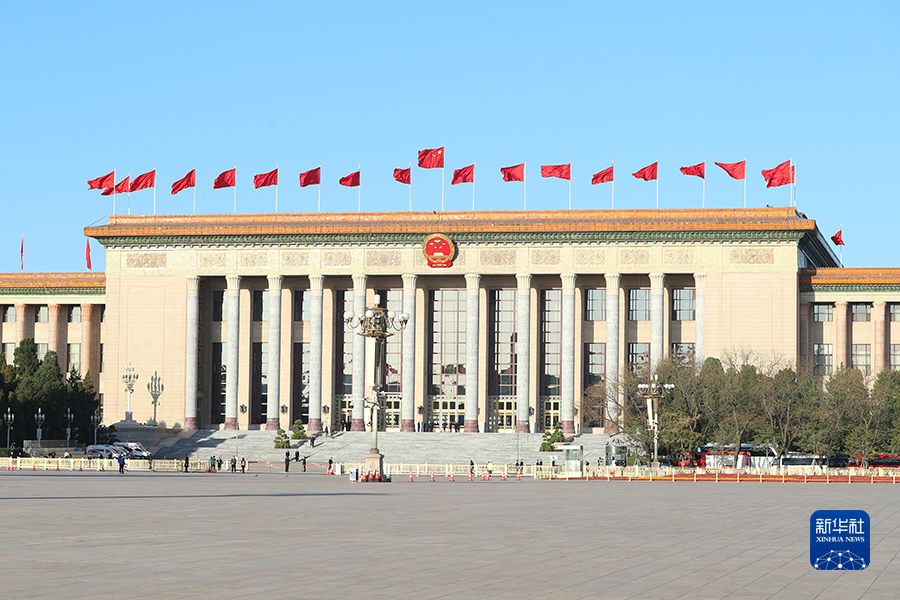 3月12日上午9時,十四屆全國人大一次會議在人民大會堂舉行第五次全體會議。圖為人民大會堂外景。 新華網記者 焦鵬 攝