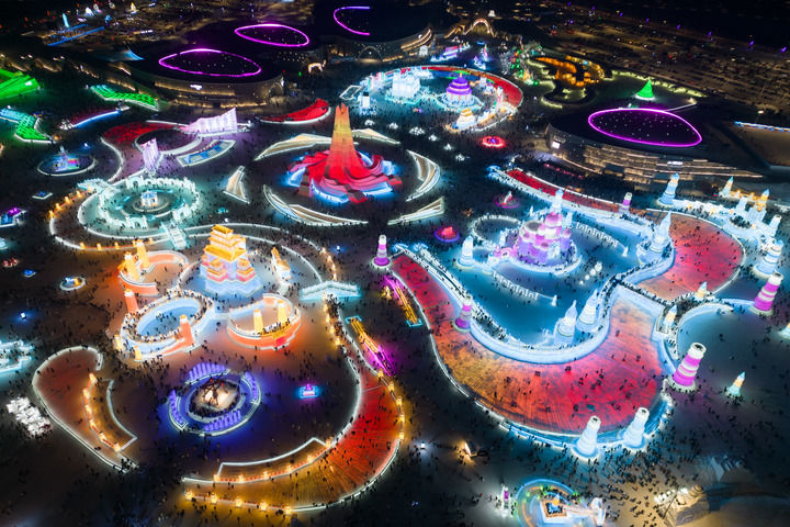 游客在哈爾濱冰雪大世界園區內游玩(無人機照片,2023年12月31日攝)。新華社記者 張濤 攝