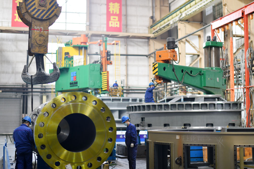 工人在哈電集團哈爾濱電機廠有限責任公司生產車間作業(2023年4月11日攝)。新華社記者 王建威 攝