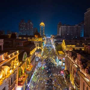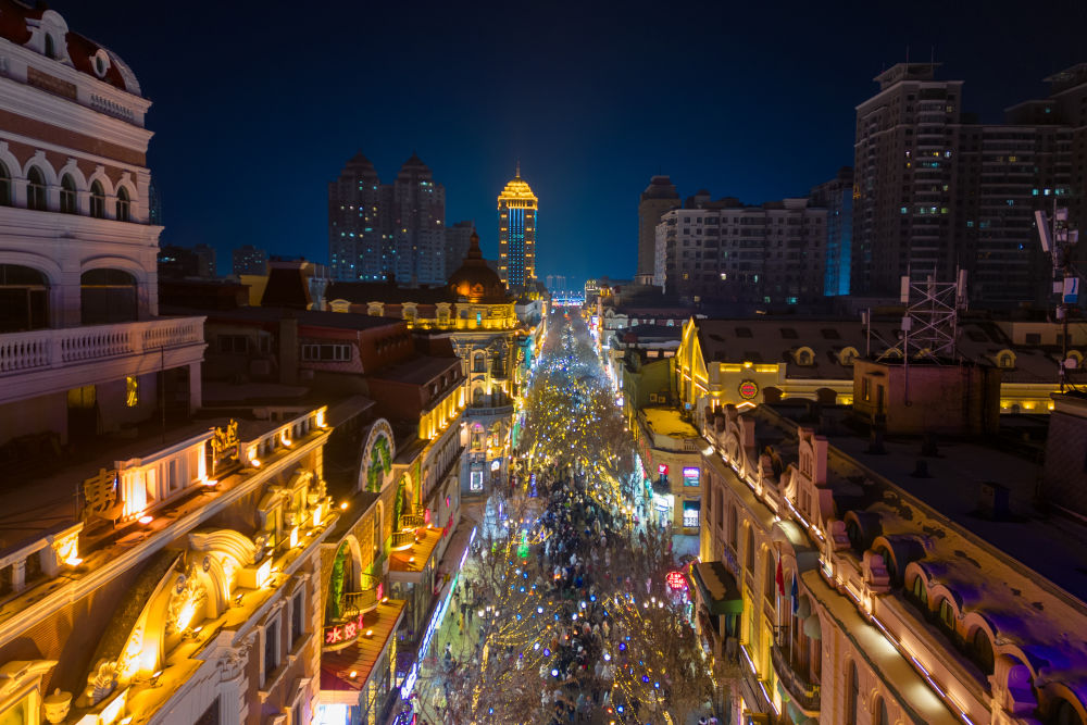 游客在哈爾濱百年老街中央大街上游玩(2024年1月9日攝,無人機照片)。新華社記者 張濤 攝