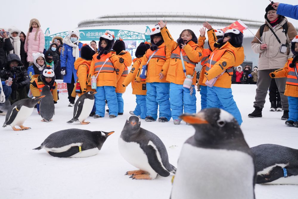 在哈爾濱極地公園,來自廣西南寧的“小砂糖橘”與企鵝互動(2024年1月6日攝)。新華社記者 王建威 攝